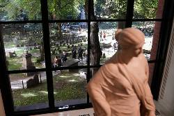 Natural light shines in from large windows where guests can look down to see one of Boston's most historic cemeteries where figures like Paul Revere, Samuel Adams, and John Hancock are buried.