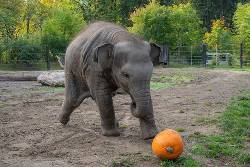 Weighing just 775 pounds (351.5 kilograms), eight-month-old Asian elephant Tula-Tu is about the heft of one of the giant pumpkins so is too small to smash them. Instead, zoo handlers gave her a small pumpkin to practice with. The little elephant dribbled the gourd around like a soccer ball, a video from the zoo shows.