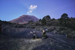 After hours of walking up the volcano’s flank, Calò’s team sets up camp in a pine grove at about 12,500 feet of elevation, an apparent safe spot from pyroclastic explosions, since the trees have managed to grow to significant height.