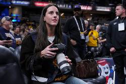Clark, donning a photographer’s vest, was credentialed by the Pacers as a photographer and snapped pictures along the baseline. She was presented with a folding seat with her personal logo before the game.