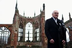 Frank-Walter Steinmeier’s pilgrimage commemorates the Nazi bombing of Coventry on the night of Nov. 14, 1940, which destroyed the 14th-century Gothic cathedral, leaving behind a roofless ruin that stands as a reminder of the ravages of war. At least 568 people were killed and more than half of Coventry’s homes were damaged or destroyed in what was the single most concentrated attack on a British city during the war.