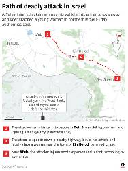 The attack began Friday afternoon in the northern city of Beit Shean, where the Palestinian man crashed his vehicle into people, killing one man and injuring a teenage boy. He then sped onto a highway, where he fatally stabbed the woman, and injured another person near the entrance to the city of Afula. That's where the attacker was shot, according to authorities.