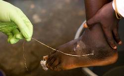 The worm is contracted by consuming water that contains larvae. It then grows inside an infected person, reaching as much as a meter long and the diameter of spaghetti. The worm then exits the person's body through a blister, which causes intense pain.