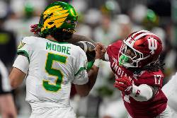 Backed up deep in his own territory, Moore set for another short throw but struck running back Dierre Hill Jr. in the shoulder as he cocked his arm. The ball popped out before the quarterback's arm went forward, with the Hoosiers recovering at the Oregon 3 to set up an easy TD that stretched the lead to 21-7.
