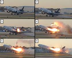 A series of six photos showed the rear of the engine starting to detach before it flew up and over the wing as flames erupted. The next image shows the wing engulfed by fire as the burning engine flies above it. The last image shows the plane starting to get airborne.