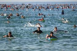 Strangers embraced and wept during the morning commemoration. Some people stood in prayer near fluttering remains of crime scene tape and the shoes abandoned as people fled the horror of the shooting. Those who joined the circle in the ocean observed a minute’s silence for the dead, the wounded and those who rushed into danger to save them.