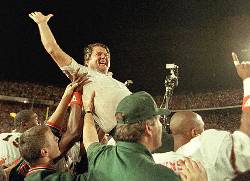 The Hurricanes ran out to a 17-0 lead over the top-ranked, unbeaten and heavily favored Cornhuskers, who clawed within 31-30 with 48 seconds left. Nebraska coach Tom Osborne decided to try a 2-point conversion instead of playing for the tie; the pass fell incomplete and Miami finished atop the AP poll. “We're No. 1,” Hurricanes coach Howard Schnellenberger said. “No doubt about it.” He was right, and Miami had its first national title.