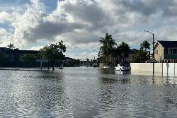 In coastal Huntington Beach, rainwater rushed through streets like a stream, and one neighborhood flooded after a local pond overflowed, spilling water into the streets and trapping parked cars.