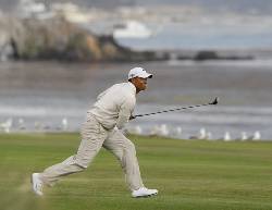 (Woods was on the slope of a bunker and hit 8-iron to 2 feet on a brick-hard green. Harrington from the fairway hit a shot that one-hopped over the green).