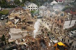Another multistory residential building was heavily damaged by the attack. Emergency services personnel used power saws to clear the debris. Piles of glass littered nearby sidewalks as building residents, some looking shaken, sat on benches.