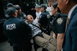 After demonstrators were blocked by security from entering the building, they stopped traffic outside, chanting “fund people, not bombs” as they were arrested and loaded onto three buses.