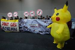 The protest centered on a pair of people wearing life-sized, inflatable Pikachu costumes who flanked a handful of activists. Protesters chanted “Only Pokemon, no fossil fuels” and “Sayonara fossil fuels.” The event included activists from across the Association of Southeast Asian Nations (ASEAN), which is home to multiple Japan-backed fossil fuel projects. One banner read: “Don’t gas ASEAN.”
