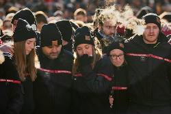 At the top of the street, in front of Le Constellation that is still largely shielded from view by white screens, the swelling crowd stood in near total silence, some weeping. Then they broke out into sustained applause — hands in gloves and mittens against the cold — as a stream of mourners and well-wishers deposited flower bouquets at a makeshift memorial piled with flowers, cuddly toys and other tributes.