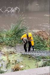Video shows a Ventura County firefighter climbing down a ladder to reach the dog, which was stuck on reeds on the edge of a flood channel northwest of Los Angeles.