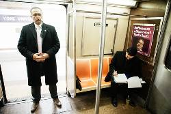 Flanked by security guards and a small clutch of aides on a Manhattan-bound train, he agreed to several selfies with wide-eyed riders, then moved to a corner seat of the train to review his briefing materials.