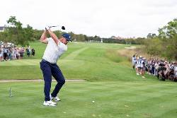 Returning to the par-5 18th, DeChambeau pulled his drive into the mud and muck left of the fairway on the rain-soaked course. He was given free relief and eventually allowed to place the golf ball. Keeping his feet stable, he ripped 3-wood onto the green to 12 feet.