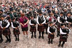 Thousands of spectators crammed the square for the world record attempt. Many of the 374 pipers had to squeeze through the crowd to the stage area. The oldest piper was 98-years-old, organisers said.
