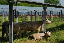 But beneath these panels is lush pasture instead of gravel, enjoyed by a small herd of cattle that spends its days munching grass and resting in the shade.