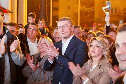 VMRO-DPMNE leader Hristijan Mickoski announced at party headquarters a “great, great” victory before hundreds of celebrating supporters.