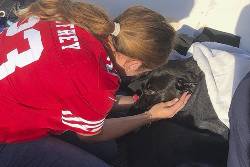 Sadie's paws and nails were badly damaged from trying to climb onto the jetty, so Barcellos and Valdez had to carry her around for about a week, Barcellos said Thursday. But she has been in great spirits and this week Sadie made her first trip to the pet store since the rescue to pick out a treat and took her first 1.5 mile (2.4 kilometers) walk.