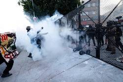 Andre Andrews Jr., a Navy veteran and independent journalist, had walked the entire route of the Los Angeles rally and captured video of the event. He said after authorities gave the dispersal order, they deployed tear-gas canisters when protesters didn't comply. Some protesters wearing shields and gas masks on the other side of a fence at the federal complex picked up the canisters and tossed them back at police. Andrews said some people also smashed concrete barriers into smaller pieces and threw them at authorities.