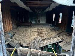 A photo from the Fire Marshal's Office shows a chandelier and white bunting decorating the ceiling above the buckled floor boards, as well as stacked benches that had been used for seating for the wedding before the collapse.