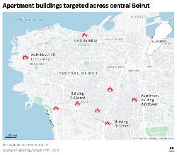 Further strikes blew up apartments near a well-known chocolate shop in the mixed commercial and residential area of Mar Elias, wiped out part of a building that housed a snack shop and hair salon in the Caracas district, destroyed the lower floors of a building along Beirut’s coastal corniche and left smoldering ruins in the densely populated neighborhood of Basta near a school sheltering displaced people in an attack that killed, among others, a young mother and her two sons.