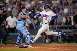 Kerkering picked up the ball and in one motion made a sidearm throw, 46 feet from the plate. The ball sailed up the third-base line, past Realmuto's outstretched mitt, and fans in the crowd of 50,563 at Dodger Stadium erupted after spending the final three innings on their feet