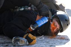 Soon at least seven officers surround him. One is on his back, and another who appears to have a canister in his hand strikes a blow to his chest. Several officers try to bring the man’s arms behind his back as he appears to resist. As they pull his arms, his face is briefly visible. The officer with the canister strikes him near his head several times.