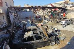 At the scene of the strike, paramedics searched for human remains around a wall that was stained with blood. Several cars were burnt and broken glass and debris littered the ground.