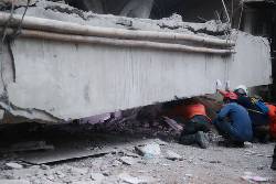 Rescuers in hardhats crawled through tight passages made of concrete blocks, steel bars and rubble collapsed in the debris, chipping away at it with hammers and hand-held power tools to try and reach those still underneath.