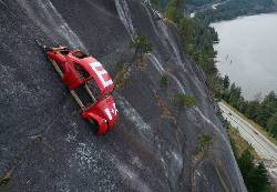 The car shell appeared on the rock face above Highway 99 in Squamish, British Columbia, last week with a large “E” on its roof, indicating University of British Columbia engineering students were carrying on a tradition of placing Beetle shells in difficult locations.