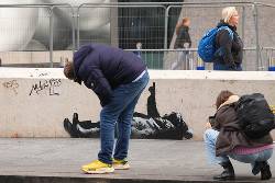 The black and white mural, painted above a garage, depicts two figures dressed in winter hats and boots lying on the ground, with one of them pointing a finger upwards.