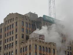 Video from TV stations showed thick rolling clouds of black smoke near the top of the 14-story Maccabees Building, a nearly century-old building designed by Albert Kahn, along Woodward Avenue, just north of downtown.