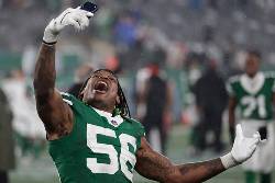 The New York Jets linebacker arrived for the team's game Sunday against the Miami Dolphins with his face made up to look like the comic and movie villain Joker — complete with a big painted-on red grin.